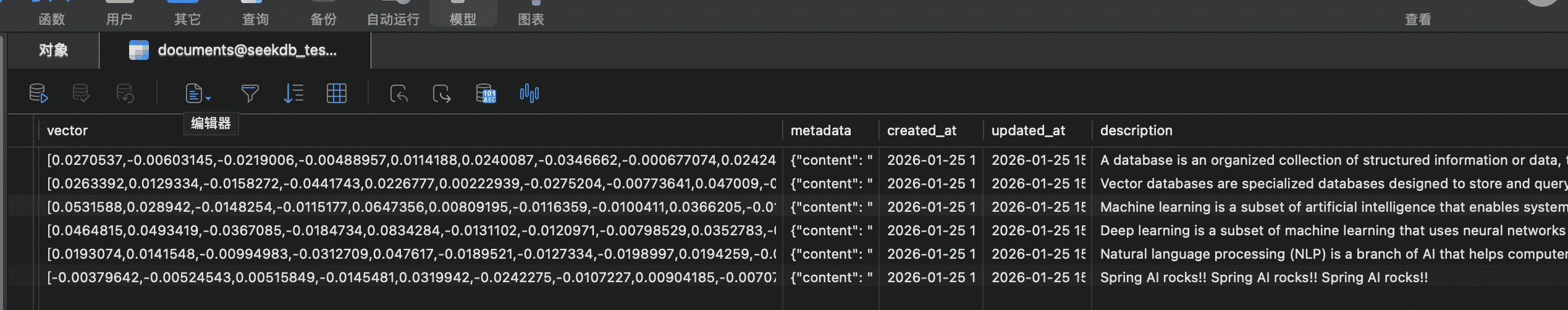 向量用 JSON 数组格式传进去,seekdb 自动解析。